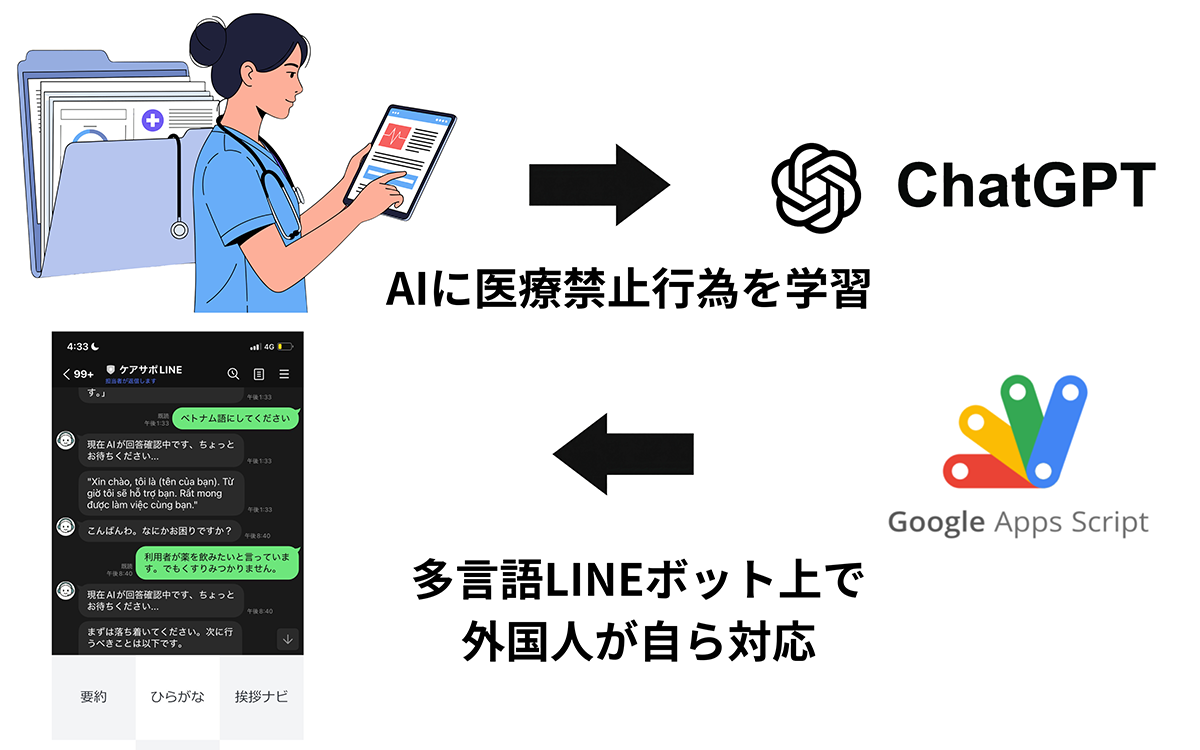 社内の医療禁止行為·業務ルールをAIに学習させ、多言語対応のAIをLINE上で運用。外国人スタッフとの日常的な質問対応を自動化しました。導入時には、AIへの学習方法や更新手順をマニュアルとして整備。社内で継続的に運用·改善できる仕組みを構築しています。